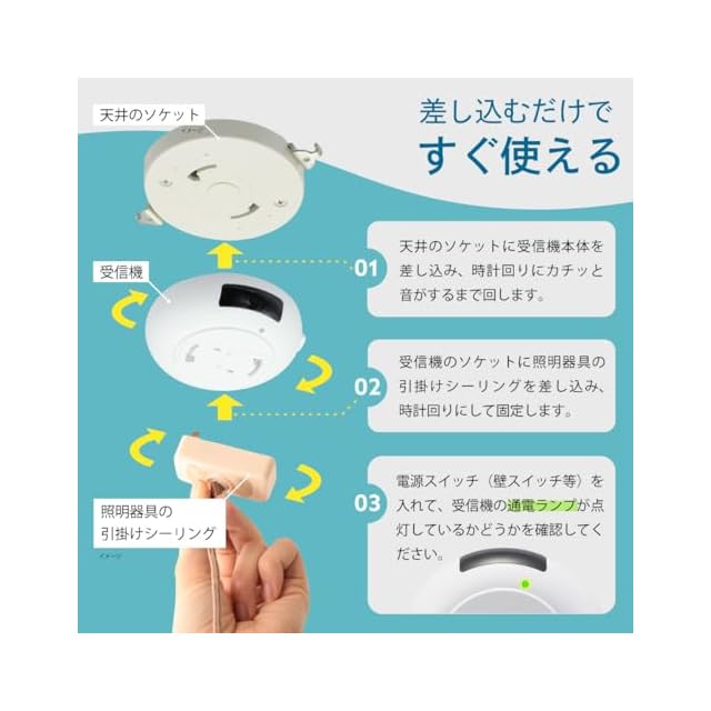 【 特 長 】 ◆赤外線リモコンで離れた場所から照明器具をオン・オフ ◆文字が見やすい大型液晶リモコン ◆毎日同じ時刻に繰り返し「自動オン・オフ」も可能、防犯対策に ◆日照不足の暗い北向き・窓なし部屋での目覚まし照明用にも ◆5時間後まで自動オフができる切タイマー機能付き ◆落下防止の「固定ロック機能」付き ◆通電ランプ付き ◆取り付けは照明器具と天井の引掛シーリングの間に受信機本体をセットするだけ、面倒な配線や工事などの必要なし