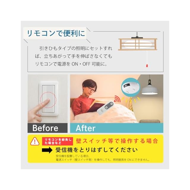 ≪ご注意≫※ 自動入・自動切・切タイマー設定後の使用時においては、リモコンの送信部を本体の受信部に向けて置いておく必要があります。※ 5kg以上の照明器具に使用しないでください。※ 5kgを超える照明器具の場合、チェーンなどを使用してください。(照明器具の落下によるけがの原因になります。)※ 定格容量3A以下の照明器具を使用してください。(容量目安 :蛍光灯・電球形蛍光灯の場合…150Wまで 、白熱灯の場合…300Wまで 、インバーター照明器具の場合…120Wまで ※容量を超えると、故障や発火の原因となります。)