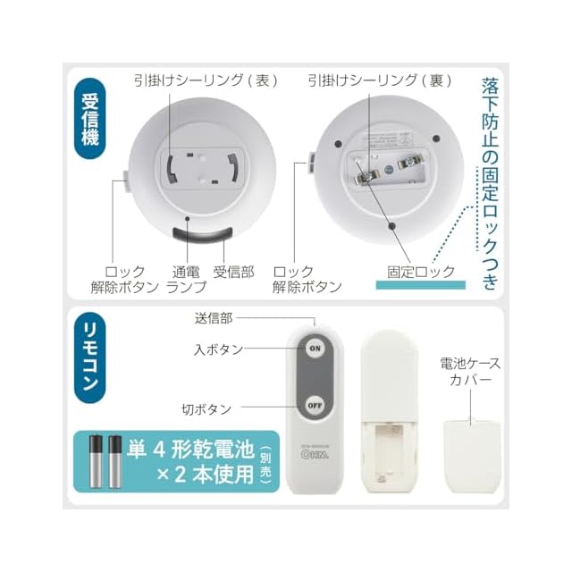 【 特 長 】 ◆赤外線リモコンで離れた場所から照明器具をオン・オフ ◆なくしにくい、使いやすい、大型リモコン採用 ◆落下防止の「固定ロック機能」付き ◆通電ランプ付き ◆取り付けは照明器具と天井の引掛シーリングの間に受信機本体をセットするだけ、面倒な配線や工事などの必要なし
