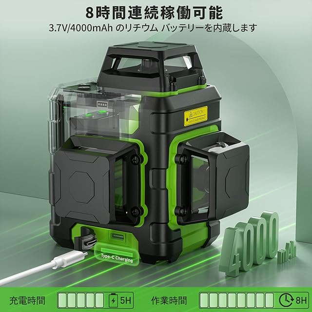 【Type-C 充電コネクター付きのリチウム イオン バッテリー】: Huepar P04CGレーザーレベラーは、大容量11.1V(最大12.6V)/2600mAhのリチウムイオンバッテリーを採用し、最大7時間の連続稼働が可能です。 バッテリーは Type-C 充電ポートを使用して充電でき、ラップトップ、モバイルバッテリー、カーチャージャーなどでも充電することもできます