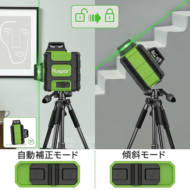 【ドイツから輸入社製グリーンレーザー&屋外パルスモード】:弊社のクロスラインレーザーは業界最大手のドイツ社製の最新グリーンレーザーユニットを採用し、温度変化に強く、市面より高い安定性を備えた明るいレーザーが照射できます。 同じ電力出力で、緑色レーザーは赤色レーザーの 2 倍明るく、動作範囲は最大20M、精度は 10メートルで±3 mm以内です。 Huepar ライン レーザー受光器を組み合わせして、パルスモードを切り替えると屋外 でレーザー照射範囲を最大50メートルまで拡張できます。