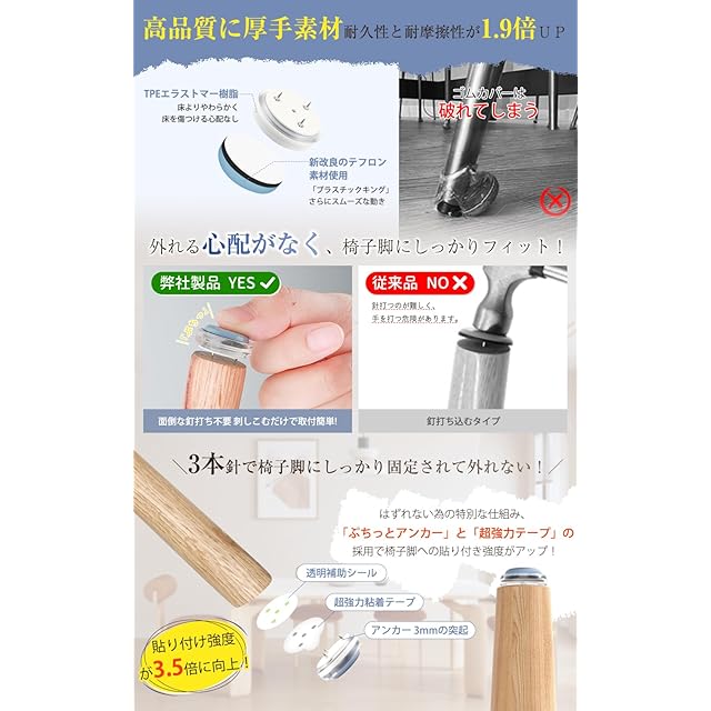 【三本針で外れにくく・安定感抜群】この椅子脚カバーは3つのアンカー(約3mmの突起)を採用し、取り付け後も外れにくく、安定感が抜群です。超強力テープを使用し、両面テープのみで取り付けた場合と比べ、3.5倍の強度を誇ります。強力に固定されるので、長時間の使用でも安心です。
