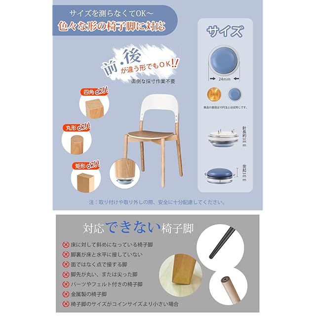 【サイズ選び不要・木製脚にどんな形状でも取り付け可能】この椅子脚カバーは、コインサイズ以上の木製椅子脚であれば、形状に関係なく取り付け可能です。四角型、丸型、長方形などはもちろん、前後の足の形状が違うデザインの椅子にも対応可能です。めんどうな採寸作業は不要です。※ご注意:木製脚専用です(金属・斜め脚・点接点脚は非対応)。安全な取り外しのため、説明書の手順をご確認ください。