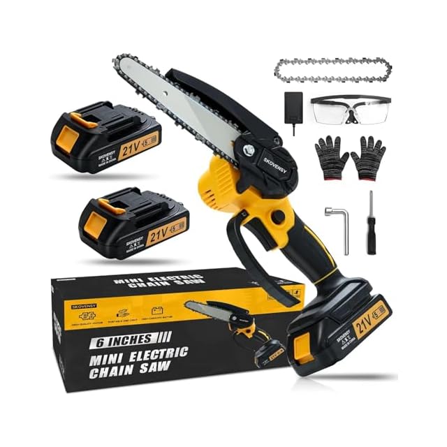 チェーンソー 充電式 小型チェーンソー ミニチェーンソー 2つのバッテリー 電動のこぎり ポータブル 充電式チェーンソー 電動チェーンソー イエロー