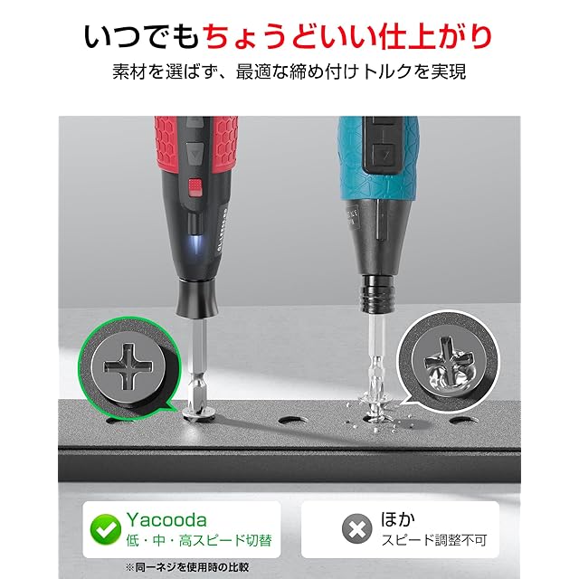 ✅【新機能・トルク3段階調整】Yacooda 電動ドライバーは、1つのボディで2つの回転モード&トルク3段階調整が可能!赤いボタンを押すだけで、【低】、【中】、【高】のトルクを簡単に切り替えられます。【低】トルクは1N・mで、電子端子台など、破損しやすい部品に。【中】トルクは2N・mで、DIYや家具の組み立てに。【高】トルクは4N・mで、回転数やトルクが必要な締め込みに。手回し時の最大耐久トルク:12N・mです。使用シーンに合わせて、最適なトルクを選んで快適に作業が進められます!