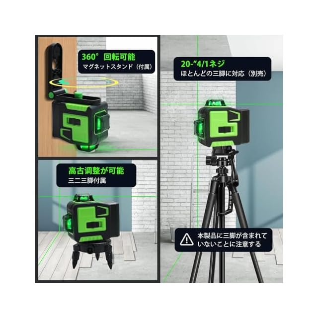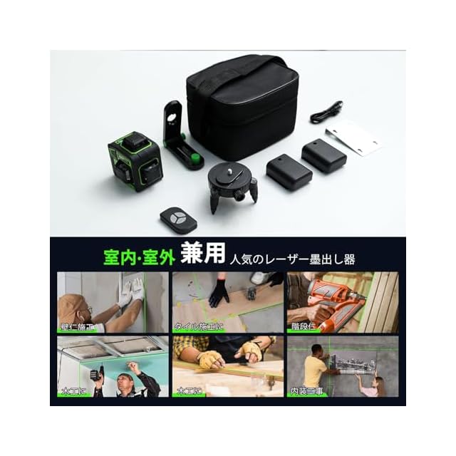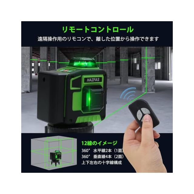 レーザー墨出し器、墨出しレーザー、3Dグリーンレーザー墨出し器、3x360°、水平器 レーザー ビルドとアライメント用、充電式バッテリー、リモコン、磁気回転スタンド レーザー安全基準:クラス2 12ライン HEILV-SPY | つむぎ屋