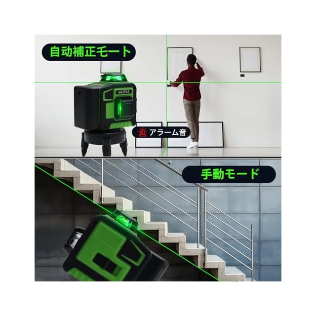 【自動水平補正と傾斜モード】自動的に水平調整され、補正範囲は±3°で、インジケーターランプと警告音で簡単に水平かどうかを判断できます。傾斜モードを搭載し、赤い点滅ボタンまたはリモコンのOUTボタンを押すだけで、レーザー墨出し器のレーザーラインをロックでき、どのような傾斜角度でも使用できます。階段やパイプなどの工事に非常に適しています。レーザー墨出し器は、精度の高い作業をサポートします。