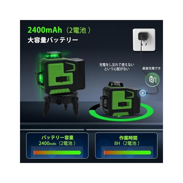【2つの充電式バッテリーパック、L字型支持台。室内外兼用】付属のL字型軽量取り付け支持台は位置微調整が可能で、作業中の位置調整に適しています。2つのバッテリーパックが付属しているため、作業に集中し、簡単で効率的なタスクを完了できます。レーザー墨出し器の作業がよりスムーズになります。バッテリーパックの交換も簡単で、長時間の作業にも対応できます。レーザー墨出し器は、プロの作業者にも最適です。
