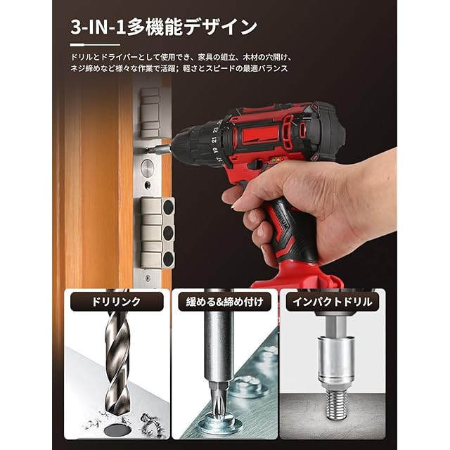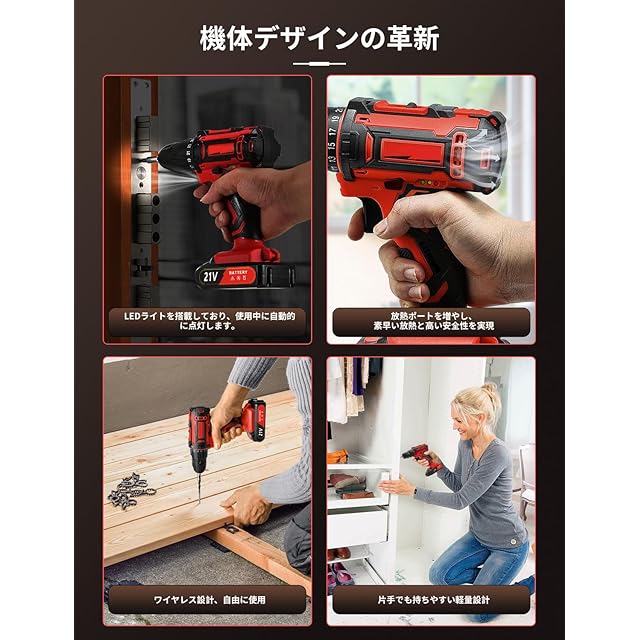 【パワフル・簡単操作・パーツ豊富】電動ドライバー 21v 電動ドリル 1500mAh バッテリー2個付き Sdove コードレス ブラシレスモーター 25段階トルク調節 無断変速 充電式ドリルドライバー 最大42N.m LEDライト 二段階スピード調節 正逆転切替 電動工具セット 21ドリル/收纳ケース/ネジ締め 穴あけ DIY家具組み立て 日本語取説