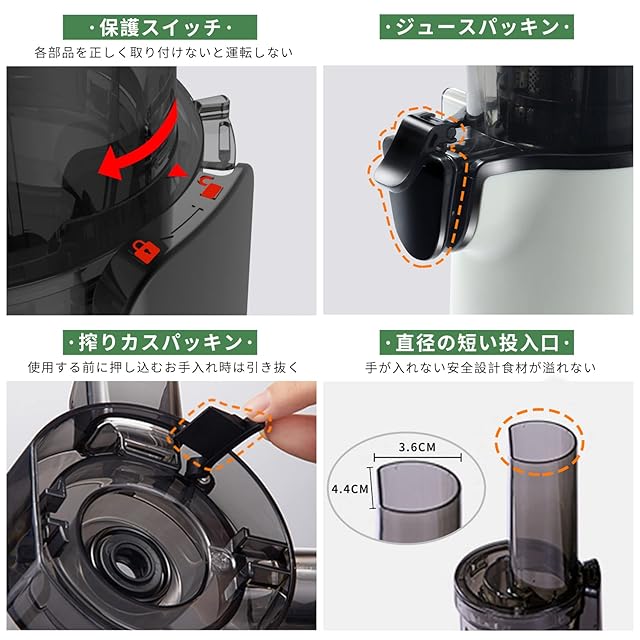 ご注意:保護スイッチを設けており、各部品を正しく取り付けないと運転しません。【超大型の投入口・安全設計・食品衛生法に適合】1.投入口は直径7.6cmの大きさで、リンゴと細い人参ならまるごと投入可能!食材を事前に細かくカットする必要はなくなり準備は簡単になります。 2..電源スイッチ一つでスタートや逆転(食材が途中で詰まったら逆転操作で入口から出せる)が可能です。3.食品衛生法に基づいて定められた基準に適合しています。環境ホルモンBPAが一切含まなく、米国が開発した最先端のTritan樹脂製ボトルを採用しており、丈夫で割れにくいのみならず、赤ちゃんから年寄りまで適用する安全なこだわり素材であなたの健康を守ります。