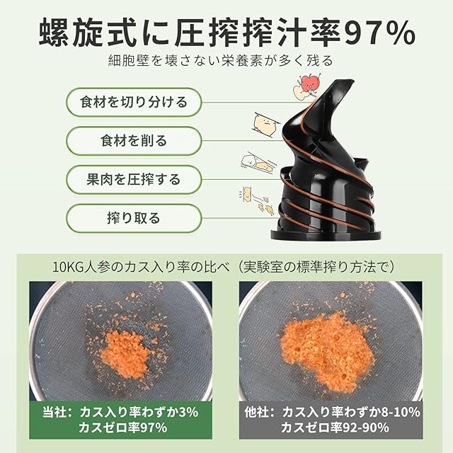 【搾りカス分離・高い搾汁率】2種類の鋼メッシュフィルターを一体的に用いて搾りカスを完璧に取り除き、100%ジュースを確保します。ジュースが大好きで健康志向のあなたにとって、食品添加物が含まれる市販のジュースより、スロージューサーで搾取したジュースが圧倒的にいいです。石臼式のスクリューで搾り、搾汁率が97%に達しました。空気が混入せずに搾るため、酸化しにくく、柔らかなでまろやかな風味が楽しめます。