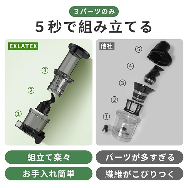 【取り外しが簡単・お手入れしやすい】搾汁したジュースとジュースの残りカスは別々の容器に入ります。全てのパーツは楽に洗えて汚れが残らず、カッター刃構造ではないので手で持っても怪我する心配はありません。搾汁後は洗い流すだけで搾りカスや汚れ等が簡単に取れますので、洗浄用ブラシの出番すらありません。※搾りカスパッキンは引き抜いてから洗ってください。