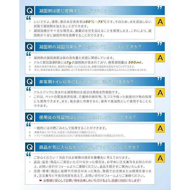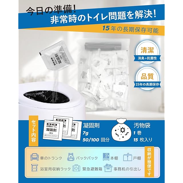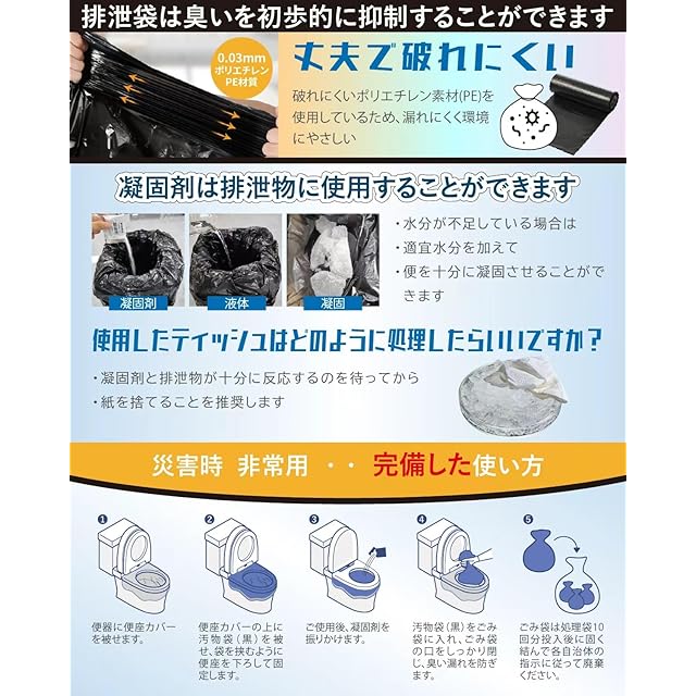 非常用トイレ 凝固剤 は、災害時やアウトドア活動に欠かせないアイテムです。当社の製品は 1 袋 7 グラムで、1 セットで 100 回使用可能です。各袋は個別包装されており、持ち運びが容易で衛生的です。この凝固剤は強力な抗菌・消臭効果を備えており、不快な臭いや細菌の繁殖を効果的に抑えます。簡易トイレ、災害用トイレとしても活躍し、地震や災害時の避難生活や断水時に大変役に立ちます。また、吸水ポリマーを搭載しており、優れた吸水性能を発揮します。トイレ凝固剤として、大便や小便の処理に便利で、簡易トイレ凝固剤としても高い性能を示します。 簡易トイレ、ポータブルトイレ、災害用トイレとして、登山や防災時、渋滞中など、様々なシーンで大活躍します。携帯トイレとしても便利で、いつでもどこでも使用できます。防災トイレ、非常用トイレとしても頼れる存在で、防災グッズとしてもおすすめです。家庭、法人、学校向けにもおすすめで、非常時に備えて安心してご利用いただけます。 高品質の素材を使用しており、長期保存が可能です。一度購入すれば、いざという時に迅速に対応できます。トイレ凝固剤は、非常用トイレ、簡易トイレ、災害用トイレなどに不可欠なアイテムです。