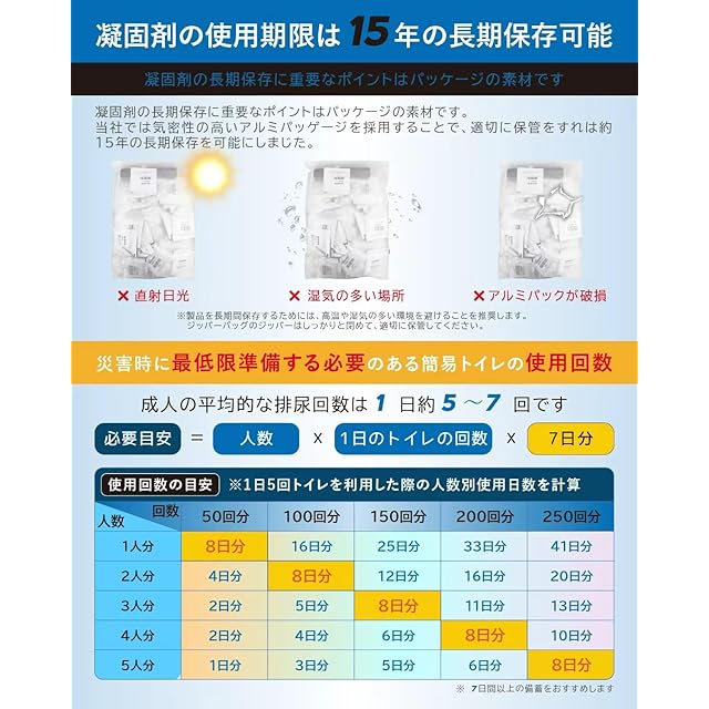 【トイレ 凝固剤 100回分×凝固剤 粉末|長期保存の実用設計】 アルミ遮光包装|直射日光下でも15年間成分安定。軽量小型設計(1包7g)|収納スペースを圧迫しない。水不要で即使用可能|断水時/車中泊/渋滞時の緊急対応。