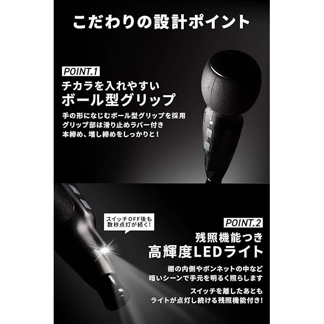 ✅【残照機能つきLEDライト】作業中の手元を明るく照らす高輝度LEDライト搭載!さらに、スイッチオフ後も約10秒間点灯が続く残照機能付き!