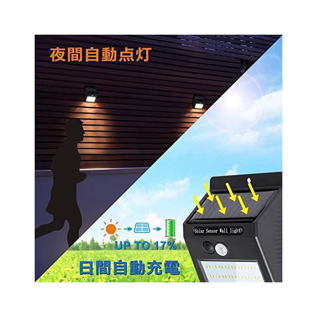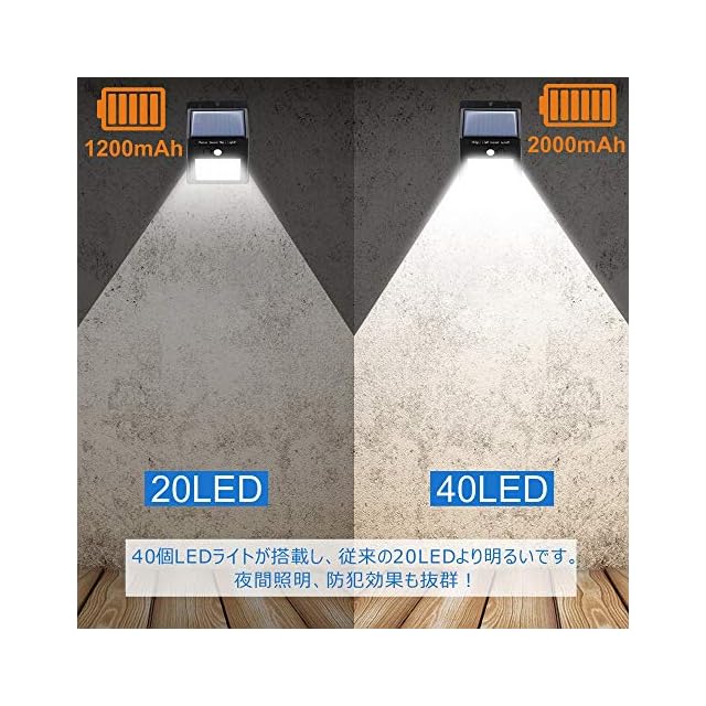 【環境に優しい太陽エネルギー・電気代0円】40LEDセンサーライトは最新版のソーラーパネルを採用して、昼間の太陽エネルギーを受けて、内蔵18650充電池には電源エネルギーに蓄積して、夜間LEDライトに電源を提供します。完全に太陽エネルギーを利用して、電気代が0!二酸化炭素の排出が0!家計に優しくて地球温暖化の対策です!直射日光の場合はエネルギー転換率は17%まで達します!ご注意:照明効果を確保するために、必ず遮るもののなく、昼ま長時間直射日光に当たる場所に設置してください。