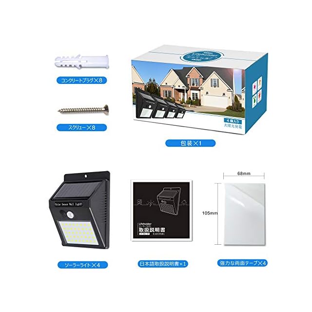 商品名:Lifeholder 40LED ソーラーライト 人感センサーライト 太陽光発電 屋外照明 玄関 軒先 駐車場 大活躍 防水 防犯 両面テープ付き 取付簡単 4個セット