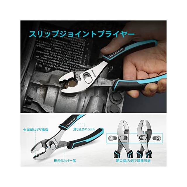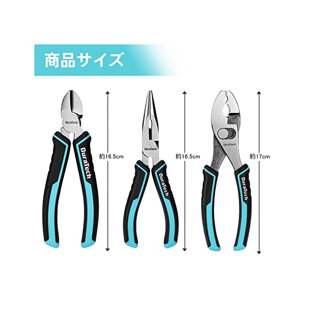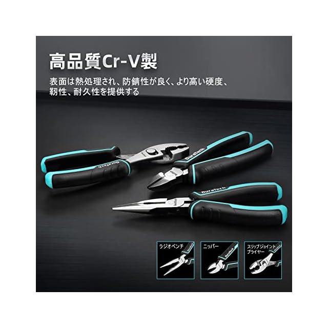 DuraTech プライヤーセット ペンチセットには、(16.5cm)ニッパー、(16.5cm)ラジオペンチ、(17cm)スリップジョイントプライヤーがあります。高品質素材を使用して、防錆性が良く、より高い硬度、より良いクランプ力、靭性、耐久性を提供します。