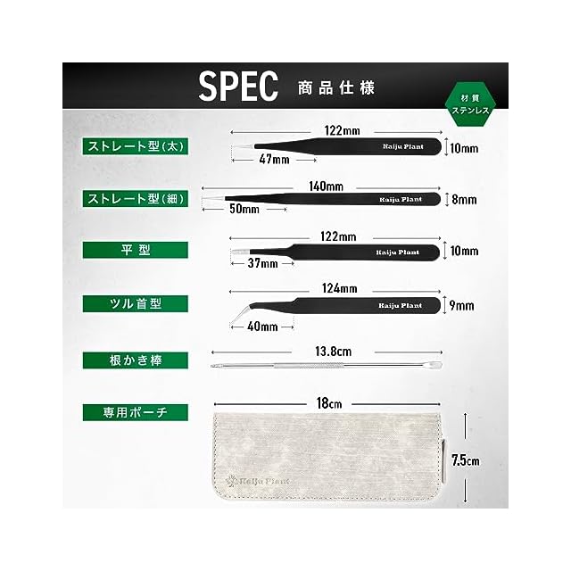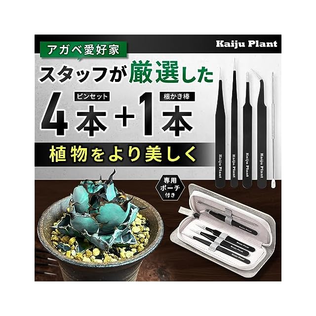 商品名:Kaiju Plant ピンセット 4種 + 根かき棒 植替え 美しく仕上げる 多肉 アガベ サボテン 園芸 DIY ポーチ付き ステンレス