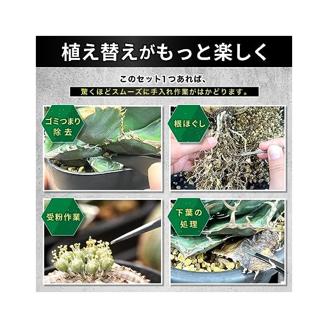 ✅【より美しく】多肉・アガベ・サボテンの植え込みに必要なピンセット4種と根かき棒をセットにしました。植え込み時に植物をより美しく仕立てることができます。さらに専用収納ケース付きで使用後も整理に困ることがありません。