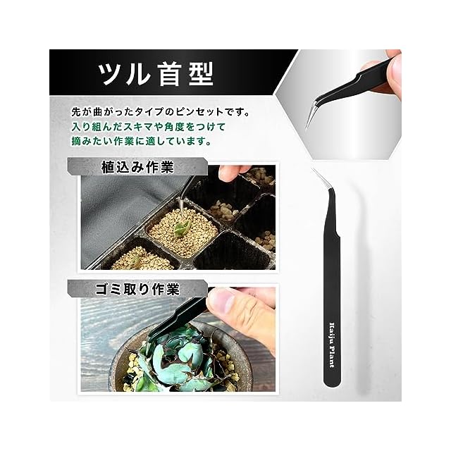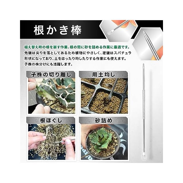 ✅【ツル首型】先の曲がったタイプのピンセットです。入り組んだスキマや角度をつけて摘みたい作業に適しています。【根かき棒】植え替え時の根を崩す作業、根の間に砂を詰める作業に最適です。先端は尖りを落としてあるため植物にやさしく、逆端はスパチュラ形状になっており、土を掘ったり均したりする作業にも使えます。