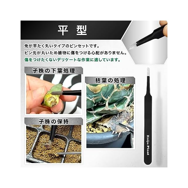 ✅【平型】先が平たく丸いタイプのピンセットです。ピン先が丸いため植物に傷をつける心配がありません。傷をつけたくないデリケートな作業に適しています。