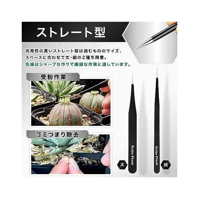 ✅【ストレート型】汎用性の高いストレート型は摘むもののサイズ、スペースに合わせて太・細の2種を用意。先端はシャープな作りで繊細な作業に適しています。葉の間に残ってしまった用土を簡単に摘みとることができます。また、花粉を摘んだり害虫を摘み取る際にも活躍します。