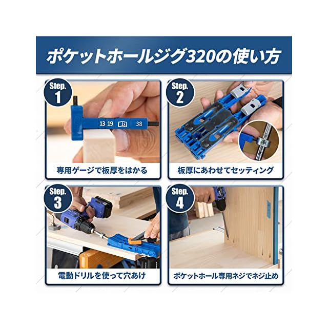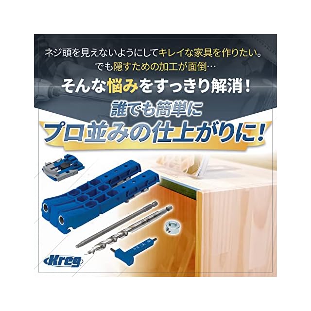 スクリューの頭が見えることなく木材をジョイント出来るポケットホールジョイント加工をするための治具セットです。斜めに穴をあけ裏側からスクリューで止めることで、簡単に本格的な家具製作をすることが出来ます。