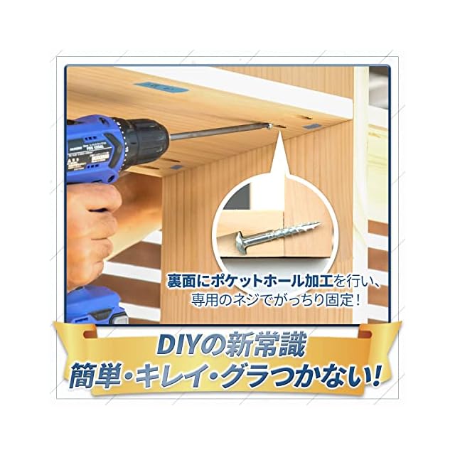 ポケットホールジョイントを使えば、ダボ等を使ったジョイントに比べて木材を非常に簡単に強固に接合できるため、DIYでの棚や机の作成でもグラつかずに組み立てが出来ます。