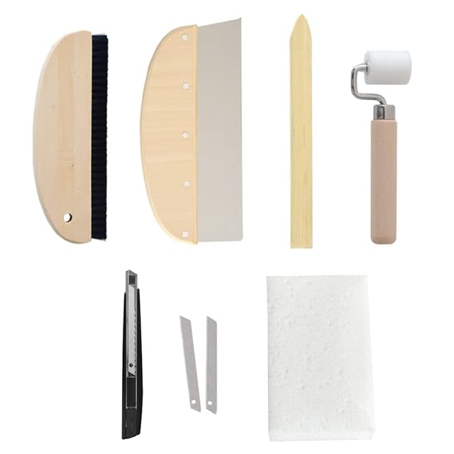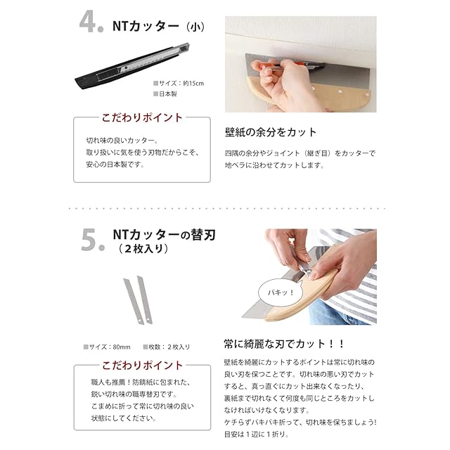 【使用用途】なでバケ:壁紙の空気を抜く、竹べら:カット時のくせつけ用、地ベラ:壁紙のつなぎ目や余分な壁紙をカットする際のカッターガイド、カッターとカッター替刃:壁紙のカットに、ジョイントローラー:壁紙のつなぎ目の圧着に使う、スポンジ:余分な糊の拭き取りや仕上げ時の拭き取りに