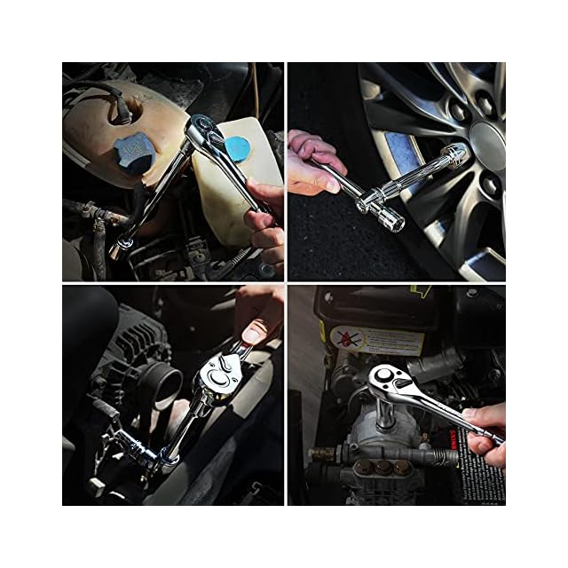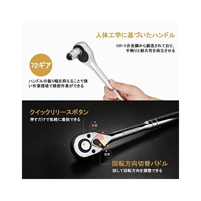 【特徴】ラチェットハンドルはクイックリリースのデザインで、ソケットの脱着はボタンを押すだけで簡単にできる。72山ギアを採用しており、細やかな動きが可能で狭い場所での作業は抜群です。