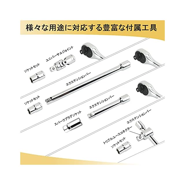 【セット内容】差込角12.7mm(1/2インチ)のツールセットです。12角ソケットセット(10、12、14、15、17、19mm)、6角ソケットセット(8、9、10、11、12、13、14、15、16、17、18、19、20、21、22、24、27、30、32mm)、エクステンションバー(差込角12.7mm×125mm、差込角12.7mm×250mm)、差込角12.7mmユニバーサルジョイント、スパークプラグソケット(16mm、21mm)、差込角12.7mmトラブルユースコネクター、72ギアラチェットハンドル