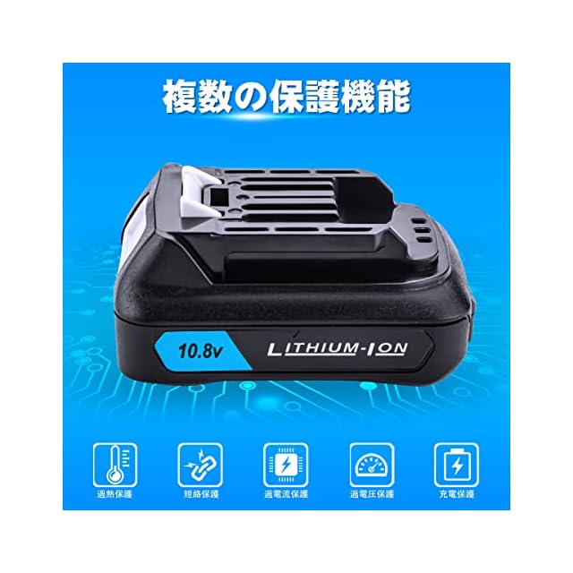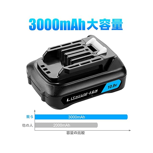 【商品のメリット】容量が拡大し、3000mAh大容量で長時間作業が可能。マキタ10.8V純正バッテリーと同様に使用でき、遜色がない互換品です。メモリー効果がないので、充電を続けてもいいです。自己放電が少ないため、長期保存しても充電に近い作業ができます。制御基板には充電を制御する保護回路を搭載!充電回数を減らし、高容量の小型軽量化を実現し、作業効率を大幅に向上しました。