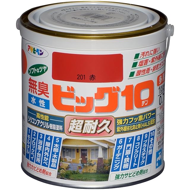 アサヒペン 塗料 ペンキ 水性ビッグ10多用途 0.7L 201赤 水性 多用途 半ツヤ ソフトなツヤ 1回塗り 超耐久 無臭 特殊フッ素樹脂配合 防カビ サビドメ剤配合 紫外線劣化防止剤配合 シックハウス対策品 日本製 | つむぎ屋