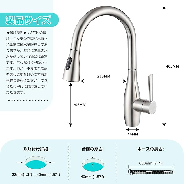 台付き(1穴) キッチン水栓x1、重力ボールx1、2つの入口管長さは60cm(G1/2ナッツ)、引き出しホースx1、取り付け部品、日本語取付説明書など(取り付け穴径32-40mm対応)★期間★:5年間の。キッチン蛇口が出荷される前に厳格な検査を経ておりますが、万が一製品不良また部 品を欠けの場合はいつでも注文ページから弊社にご連絡ください!できるだけ早めに 対応させていただきます。口から交換しようと思っている方にお勧めです。