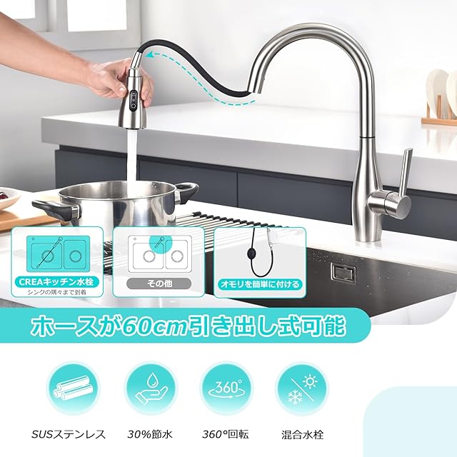 ホース引き出し式&360度回転:ホースは約60cm引き出し可能で、シンクの内を自在に移動できます。お掃除に楽々になれます。子供の手の届かない場合、腰が痛い場合には便利です。