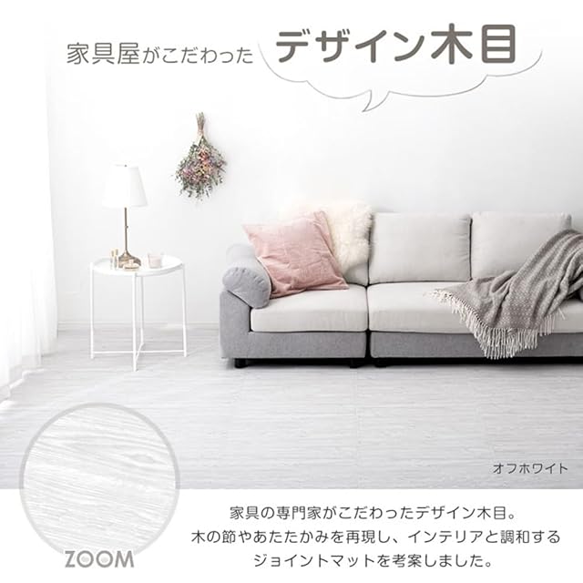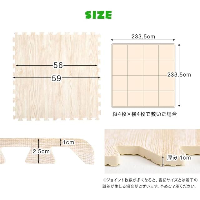 商品の仕様上、ジョイント部分(サイドパーツ含む)の木目の柄は合わない場合がございます。 ジョイントマットに使用する樹脂素材については、より安全な素材となるよう技術の向上がなされており、その過程で現在使用している素材はPEと記載を行うことが適切となりましたので、2019年1月21日にEVAからPEに表記を変更しました。日本の大手量販店でも随時、記載の変更が行われており、品質を悪化させたものではありませんのでご安心ください。 ・床材(塩化ビニル・フローリング等)によって、色移りや変色が起こる場合がございます。床とマットの間に敷物や防護シートを敷いていただくことを推奨しております。 ※2020年2月26日より商品ページでの「大判58cmタイプ」の表記を「大判59cm」に変更をしました。 実際の商品サイズに変更はございませんので、過去58cmタイプをお買い上げいただいたお客様は、そのまま接続が可能です。 ※2022年12月1日にホワイトとライトグレーの販売を終了し、ライトオークとオフホワイトの販売を開始しました。