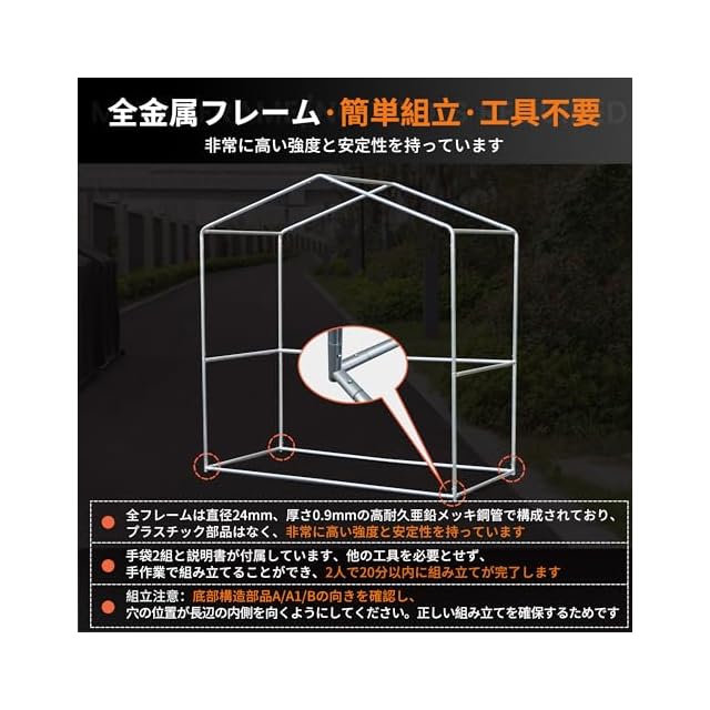 [簡単組立の工具不要]: 組立方法は、ジョイントにフレームを差し込み、ネジ留めするだけ。工具は必要ありません、手を動かすだけで30分程度でできる!(注1:鉄パイプには防錆油が塗ってあります。付属の手袋を着用して取り付けてください。注2:フレームのロックボタンとの穴が合わない場合は、説明書ステップ1の部品の向きが正確なのかをチェックして下さい、商品画像のフレーム図に記載されている組立注意の文字を参照してください。)