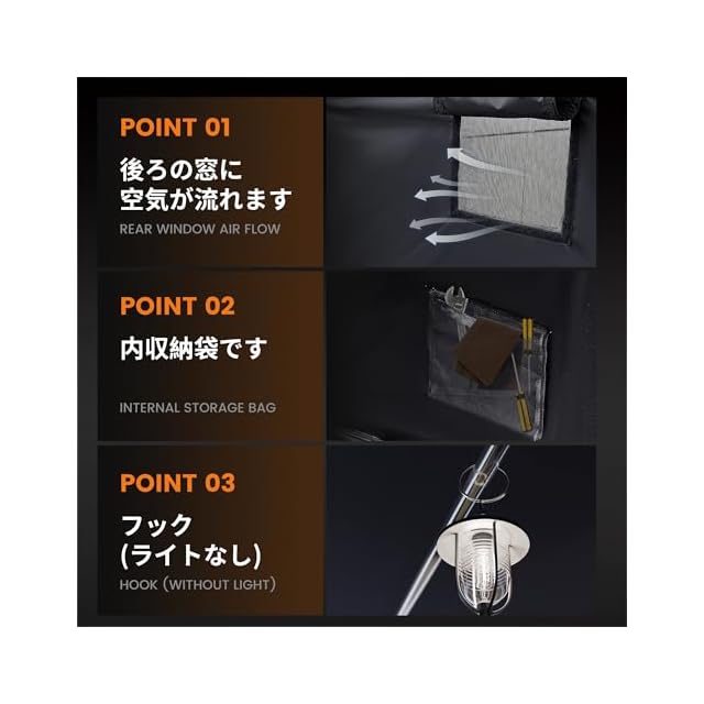 [付属部品]:カバーの後方には通気用の小さなメッシュウィンドウがあります。カバー内部には、日常的なツールやタオルを収納するための収納袋が含まれ、照明を吊るすための取り外し可能なフックも付いており、サイクルハウス内で愛車のメンテナンスや清掃を行う際に便利です。パッケージには手袋2組と1部の組み立て説明書が含まれています、組み立てが簡単に行えます。また、強化用のU型地釘、ロープ、L型地釘、弾力ロープも多数含まれています。