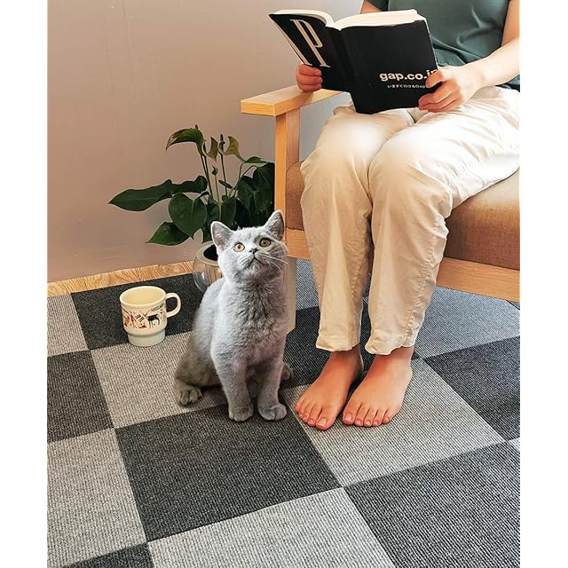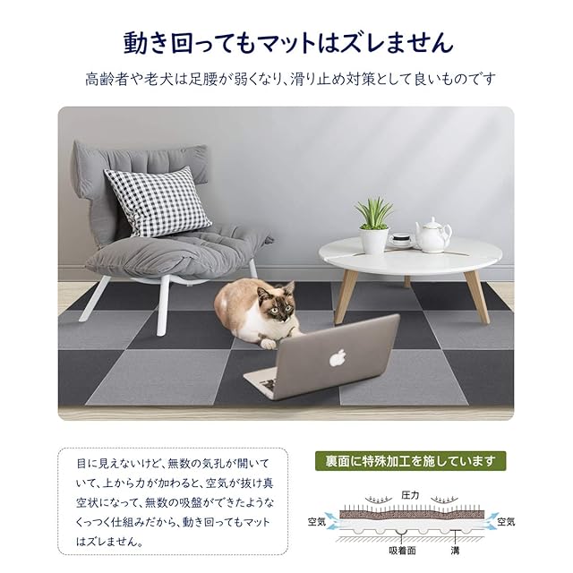 【ずれない 吸着タイルカーペット】空気が抜け真空状態になって無数の吸盤ができたようなくっつく仕組みだから、動き回ってもマットはズレません。厚み約4mmのマットですので、つまずきにくく、扉の開閉の妨げにもなりません。引っ掛かったりする恐れが少なくなる。高齢者や老犬は足腰が弱くなり、滑り止め対策として良いものです。
