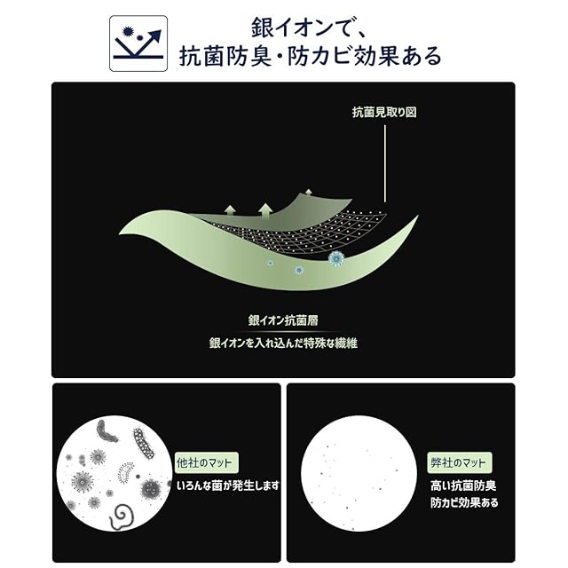 【保温性/抗菌性あるアップグレード素材】■裏面はアップグレードされたポリウレタン素材、他の製品より柔らかくて、耐久性があり、フローリングに長時間ついても糊のような粘着質はつかない。保温性に優れて、冬や冷房の冷たいフローリングで寒さの心配もありません。■表面は銀イオンを入れ込んだ特殊な繊維で、高い抗菌防臭・防カビ効果で、マットを清潔に保ちます。