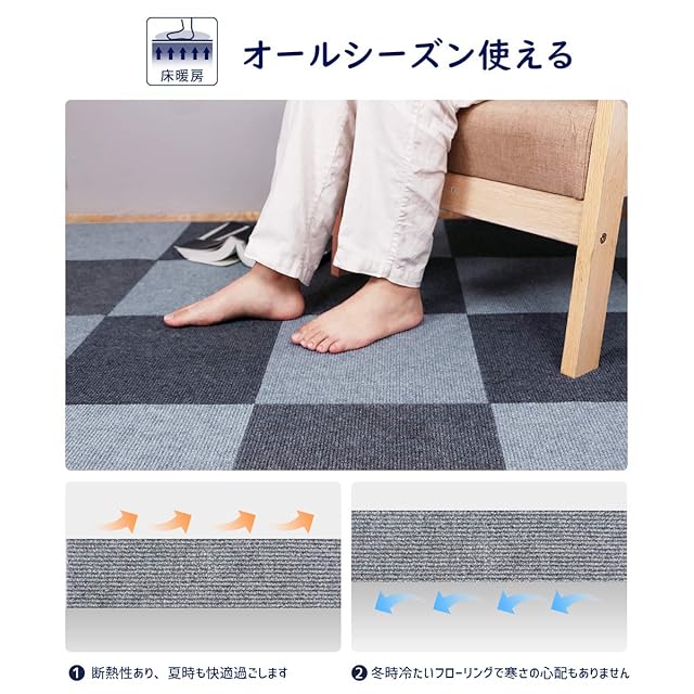 【適応性が広い】カーペットを敷いた床は保温性あり、防音性、遮音性に優れ、ホコリも舞上がりにくくて、ずれないという特性があります。■使用場所が多い:①玄関周り(自転車や椅子などの床キズ.汚れ防止に便利。) ②廊下(老犬や高齢者は足腰が弱くなり、滑り止め対策として) ③キッチン(ガラスや陶器の食器を落とした場合には、衝撃を吸収してくれるので割れにくい) ④室内(落下音や椅子を引く時の衝撃音を吸収軽減するため、防音対策に最適)など。