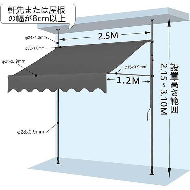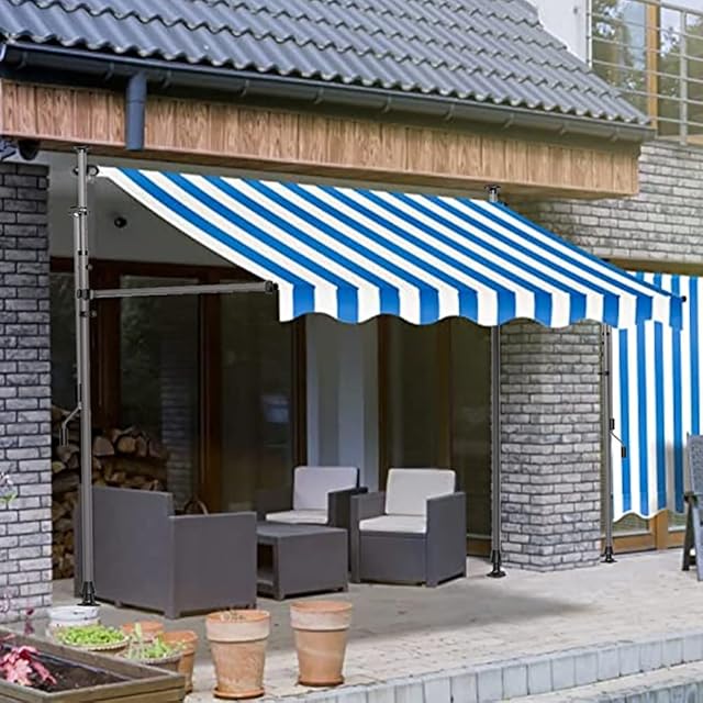 オーニング オーニングテント 伸縮タイプ 日よけ 巻き取り式 サンシェード ひさし 紫外線 UV カット クールサマーオーニング 角度 高さの調節が可能 簡単設置 (青と白, 250cm) | つむぎ屋
