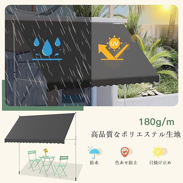 【説得力のある品質】:ガーデン用日よけ オーニングのフレームは、丈夫な鋼材で作られています。厚い(210 g/m²)、抗紫外線(UV50+)、防汚性、防水性のあるポリエステルとPUコーティングにより、日よけは屋外での使用に最適です。また、生地は洗濯でき、汚れた場合は簡単にクリーニングできます。