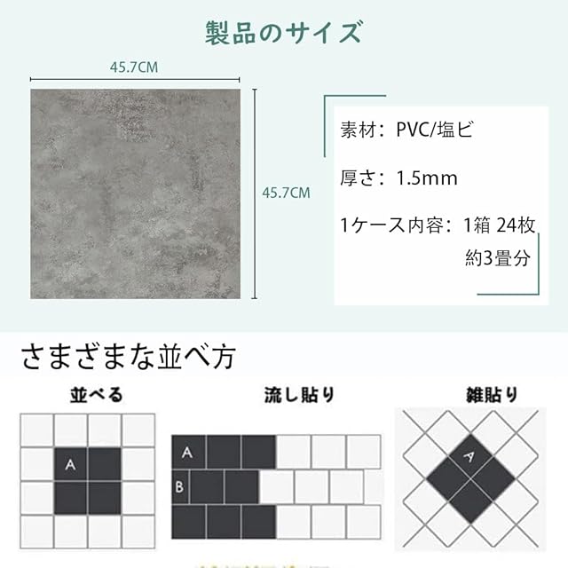 【商品仕様】サイズ(約):45.7cm×45.7cm、厚み:約1.5mm セット数:1セット 24枚 約3畳分 重量:1セット 約15KG