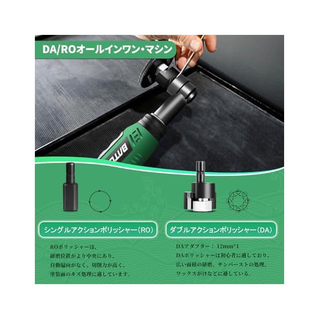 【2種類の研磨ヘッド】BATOCA S 6アップグレードセットには、2つの研磨ヘッド:ストレートヘッドとベンドヘッドが含まれています。ストレートヘッドの回転数は最高21000回転!ストレートヘッド回転速度範囲:4200-21000 RPM、ベンドヘッド回転速度範囲:1000-5000 RPM.2種類の研磨ヘッドは異なる研磨領域:車内スリット、車両ミラー、ヘッドライト研磨などに適用できる。点状研磨から仕上げまで、これまでにない柔軟性と簡便さ、BATOCA S 6研磨機はあなたの最適な選択です。