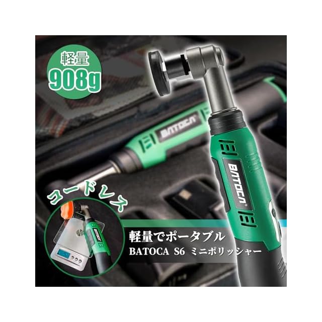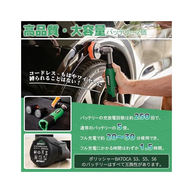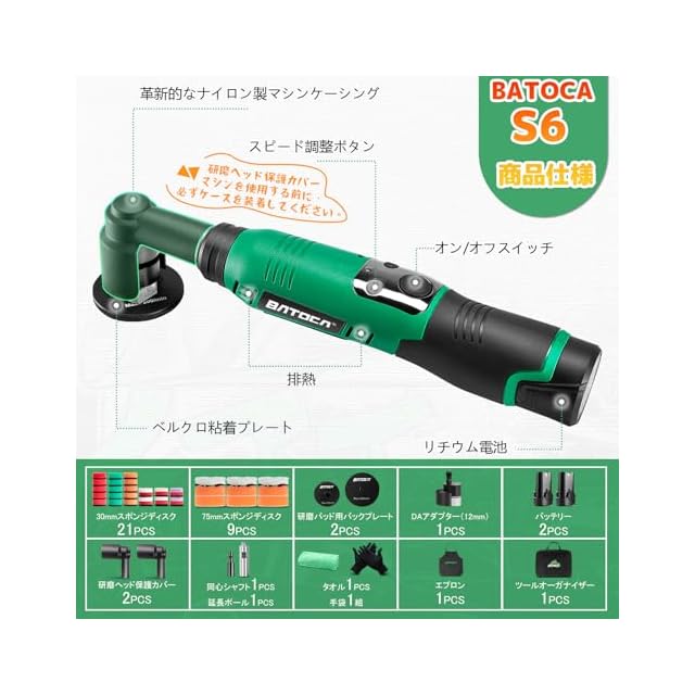 BATOCA S6 ポリッシャー コードレス 充電式 電動 車 30/75mm 6段変速 【12V 2.0Ah S3/S5/S6 ユニバーサル・バッテリー2個】 オールラウンドポリッシャー【車磨き・ヘッドライト・ホイール磨き】収納バック・日本語説明書付き