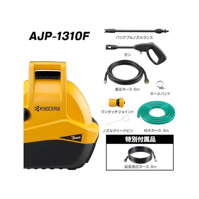 京セラ(Kyocera) 旧リョービ 高圧洗浄機 延長高圧ホース(8M)セット AJP-1310F2 4988352【水受けトレイ付で床面や室内への気になる水垂れをガード】 自吸も可能 最大許容圧力9.0Mpa 高圧ホース5M 軽量・コンパクト収納 節水 エントリーモデル イエロー