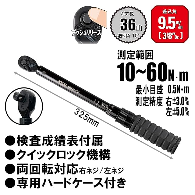 最小目盛り:0.5N・m、差込角:9.5mm、ラチェットギア数:36山