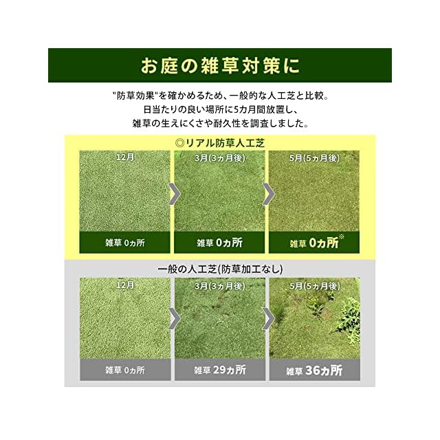※2025年4月3日:一部仕様(U字釘の色)リニューアルしました。 変更前:シルバー 変更後:グリーン 在庫の都合上、リニューアル前・後の商品が前後してお届けとなる場合がございます。予めご了承ください。雑草対策の新常識。「敷くだけ」で雑草が生えない人工芝です。